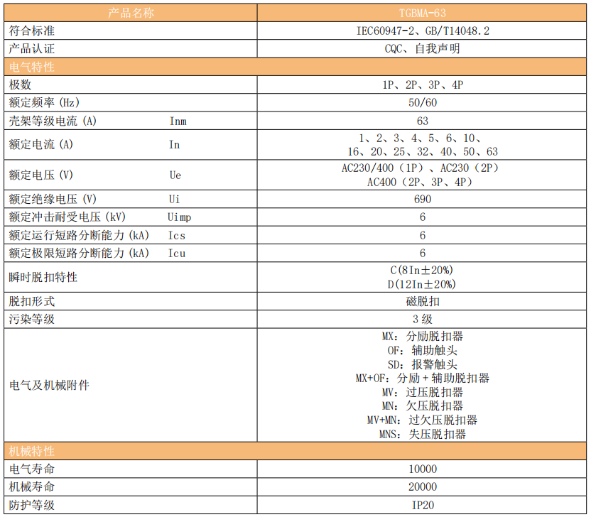 TGBMA-63 單磁式斷路器 ( 以下簡稱斷路器 ) 主要適用于交流 50Hz/60Hz,額定電流1A至63A,額定電壓230V或400V的配電網絡中。適用于醫療IT配電系統、電機保護及建筑消防系統等領域的低壓終端配電,作為短路保護開關,也可與熱繼電器或電機啟動器配合使用,實現過載保護。