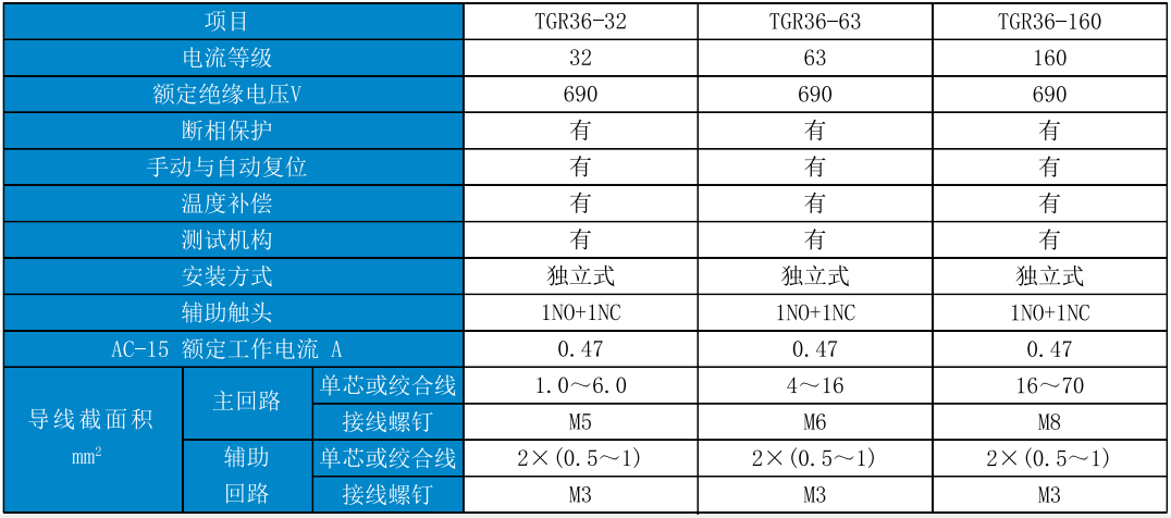TGR36系列熱過載繼電器(以下簡稱繼電器),適用于交流50Hz(或60Hz)、工作電壓至690V及以下、電流至160A的長期工作或間斷長期工作的交流電動機的過載保護和斷相保護之用。