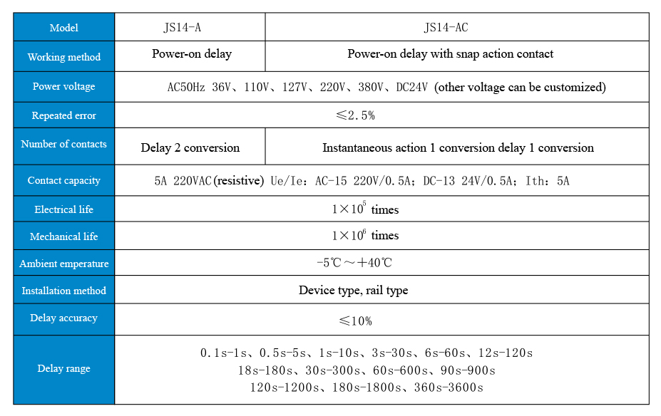 JS14-A series time relay is used in AC 50Hz control circuit with rated control power voltage of 380V and below or with A DC 24V voltage as delay element for turn on or turn off circuits as scheduled.